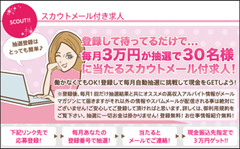 | このコーナーでは、お金が欲しいけど働くのまではちょっとって思っている人にオススメです。 登録して待ってるだけで毎月3万円が抽選で30名様に当たるスカウトメール付求人になります。 働かなくても大丈夫です。登録して毎月自動抽選を自動的に行いますので抽選に当たりますと3万円をプレゼントしております。 抽選登録は簡単です! |